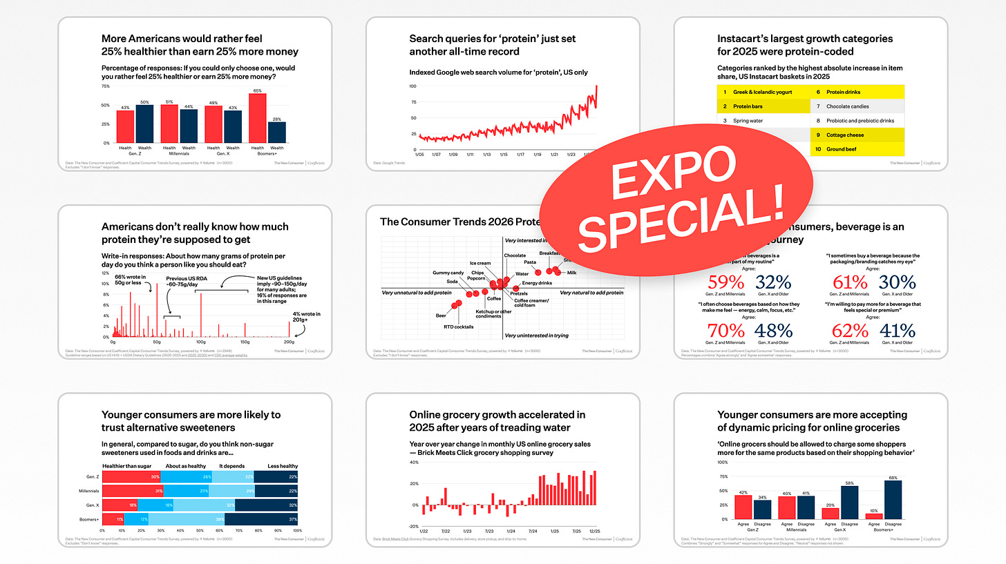 This latest Consumer Trends report is a 68-slide presentation that you can view and download for free on my website, just in time for Expo West. Because you’re a TNC on Substack reader, here’s a direct link to download the report as a PDF. Please feel free to share widely.