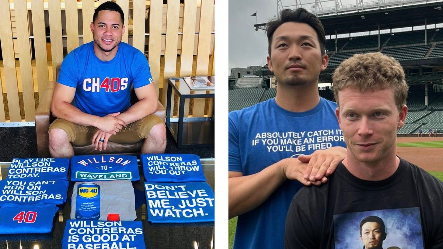 In today’s era of infinite subcultures, wearing an Obvious Shirt is also a way to express yourself down to your favorite player, especially if they don’t have a lot of merch designed around them. That, too, has helped: Many MLB players, often the non-megastars, have actively embraced Obvious Shirts, such as former Cub Willson Contreras (pictured here, left, with two current Cubs stars, Seiya Suzuki and Pete Crow-Armstrong, right).