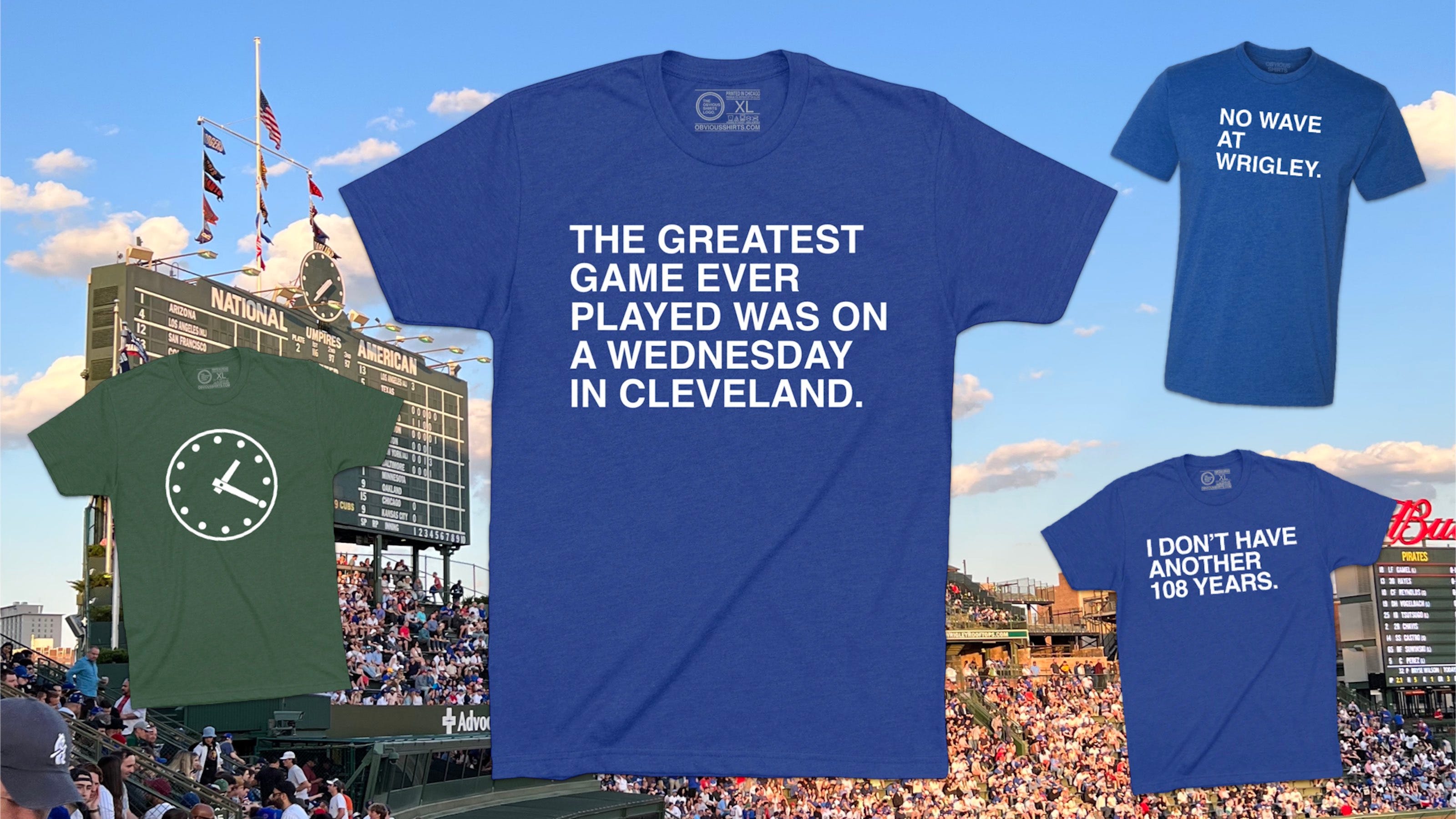Perhaps, this week for the playoffs, “MY FAVORITE SPORT IS OCTOBER BASEBALL.” Or a personal favorite — the one I wear to games — “NO WAVE AT WRIGLEY.” Or the all-time best seller, “THE GREATEST GAME EVER PLAYED WAS ON A WEDNESDAY IN CLEVELAND.” — an ode to the Cubs’ World Series victory in 2016, its first championship in 108 years.